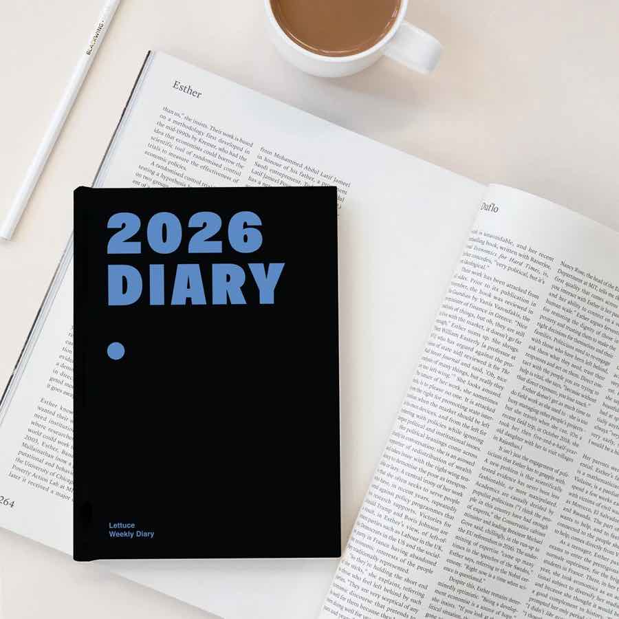 The Lettuce Weekly Diary 2026 in Midnight is a beautifully designed A5 planner made for effortless organisation. Its sturdy lie-flat hardcover opens to spacious two-page weekly spreads, with to-do lists on the left and weekly planning on the right. A monthly double-page planner helps keep big-picture goals in view, while the ribbon marker ensures easy navigation.