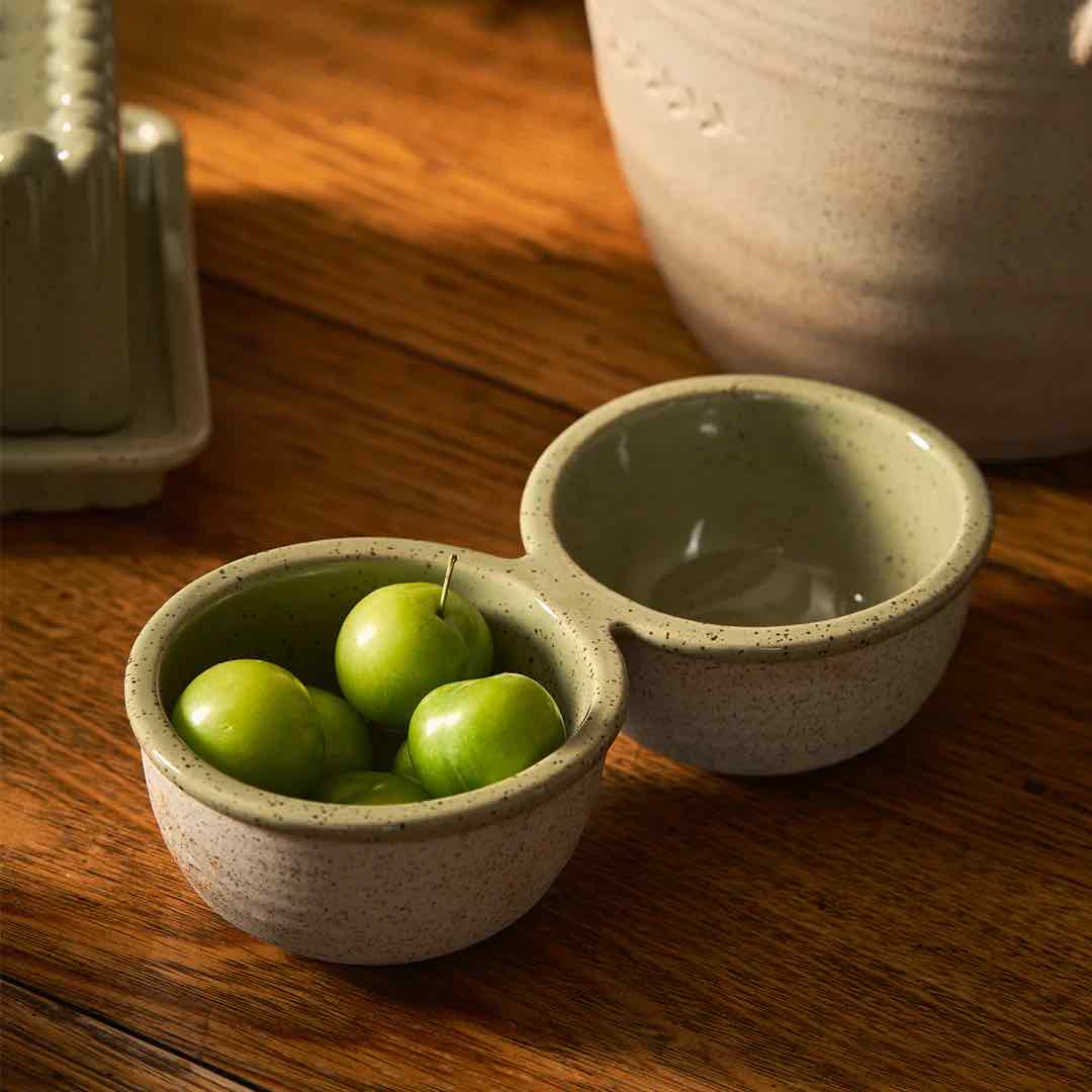 Inspired by the steady rhythm of the kitchen, this collection celebrates the beauty of daily preparation and time spent cooking. Subtle glazes and gentle leaf embellishments bring softness and balance to the table, finished with a green reactive glaze and delicate speckling over an earthy clay body.