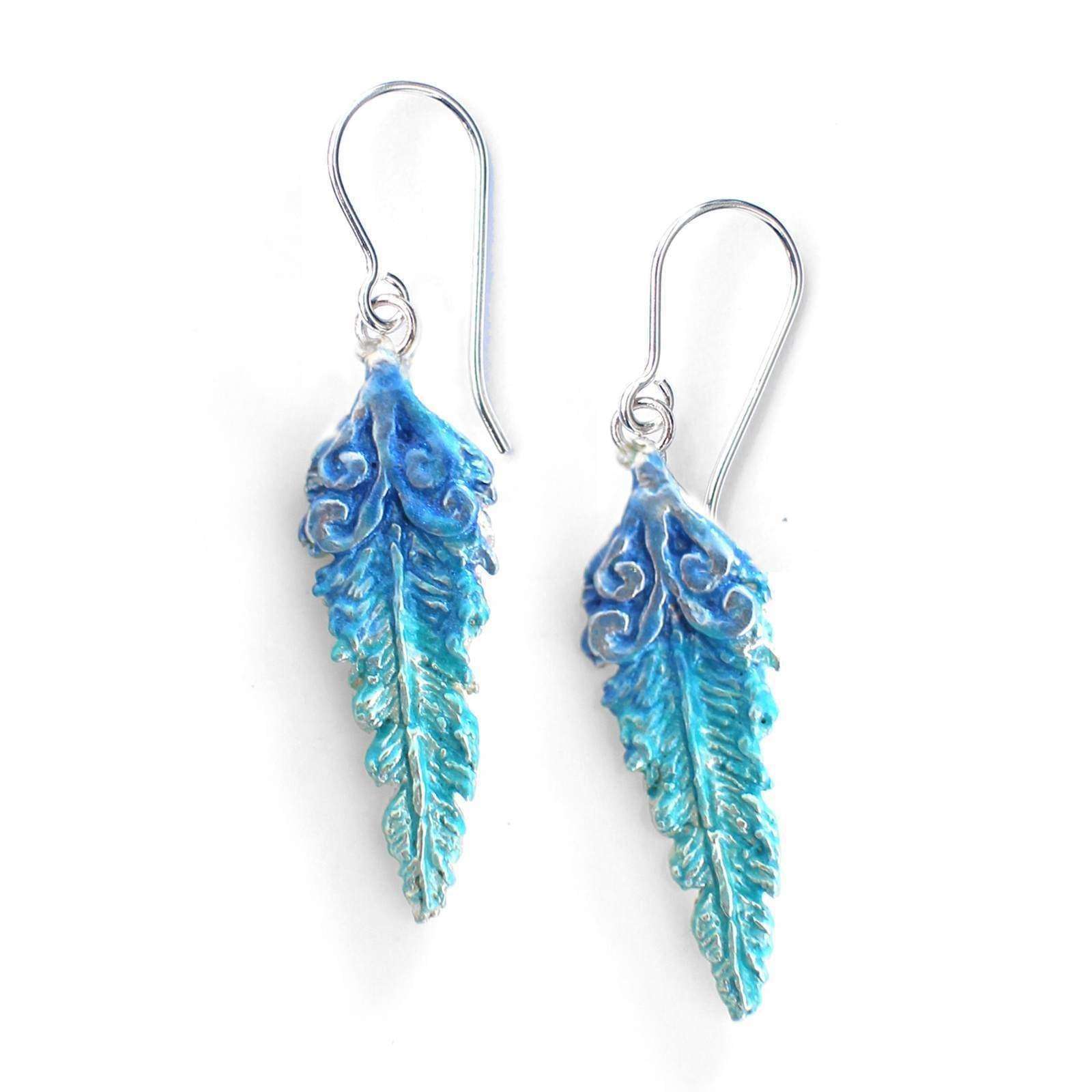 Sterling silver feathers (2.5cm), handpainted with porcelain paint in vivid blues and aqua, with koru detail. Hanging from sterling silver earhooks.