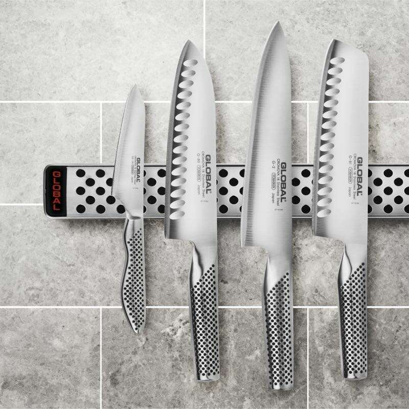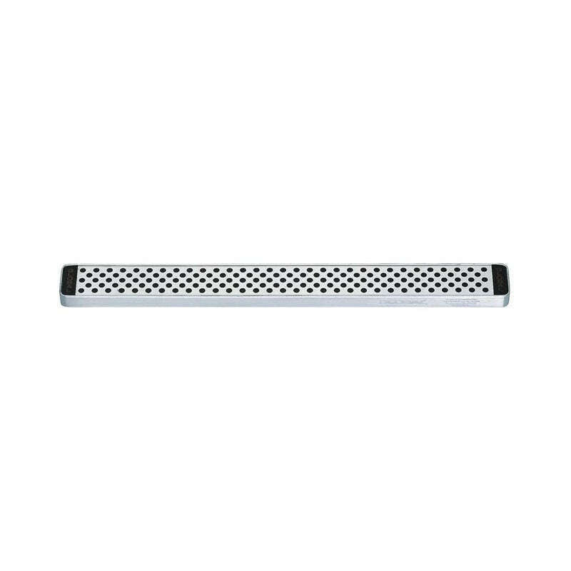 Crafted from high-quality stainless steel, this sleek 51cm Magnetic Knife Rack is tailored to complement your array of Global kitchen knives. Boasting a distinctive dot pattern design, this storage solution features a robust magnet strip that can firmly hold even the bulkiest knives, gadgets, and utensils in place. The Global 51cm Magnetic Knife Rack offers a practical substitute for a traditional knife block, keeping your knives within easy reach while decluttering your kitchen countertop.