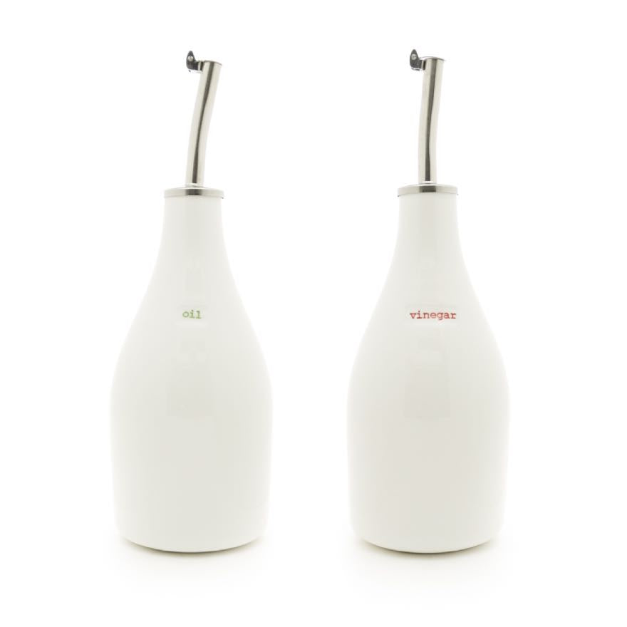 Store and pour in style with this Keith Brymer Jones ceramic oil and vinegar bottle set. Hand stamped with ‘oil’ in green and ‘vinegar’ in red using the signature typewriter font, this elegant pair combines everyday practicality with contemporary design. Perfect for the kitchen bench or table.