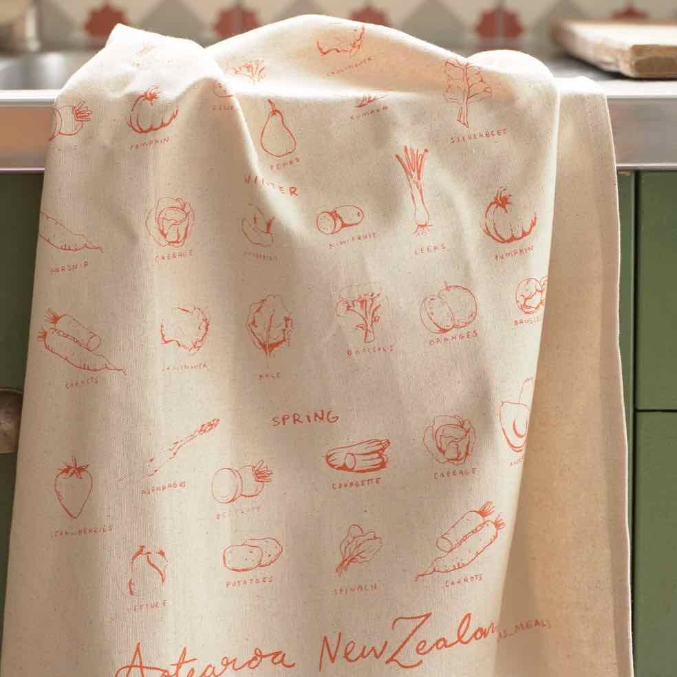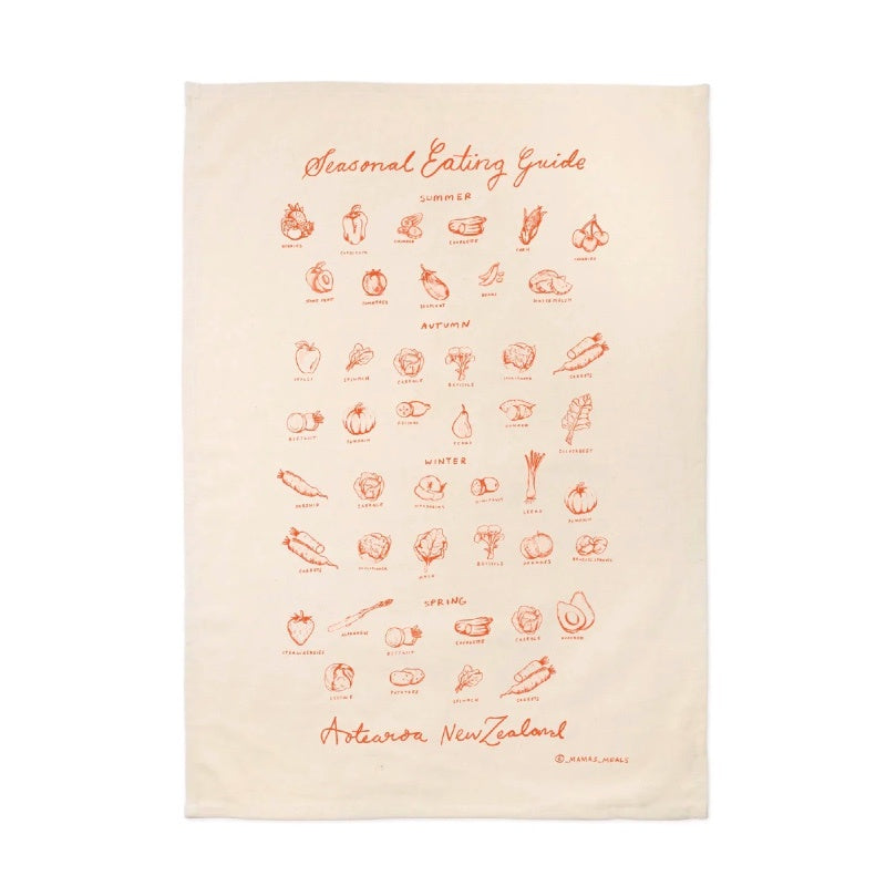 This limited-edition organic cotton tea towel is a must-have kitchen essential, combining everyday functionality with thoughtful design. Featuring the hand-drawn Seasonal Eating Guide from Family Cooking, it offers a practical reference to what produce is in season across Aotearoa. Locally screen printed and crafted from 100% organic cotton, this durable and absorbent tea towel is designed for daily use while adding a natural, elevated touch to any kitchen. Both practical and meaningful, it’s a beautiful keepsake for home cooks and a useful guide for seasonal, mindful cooking.