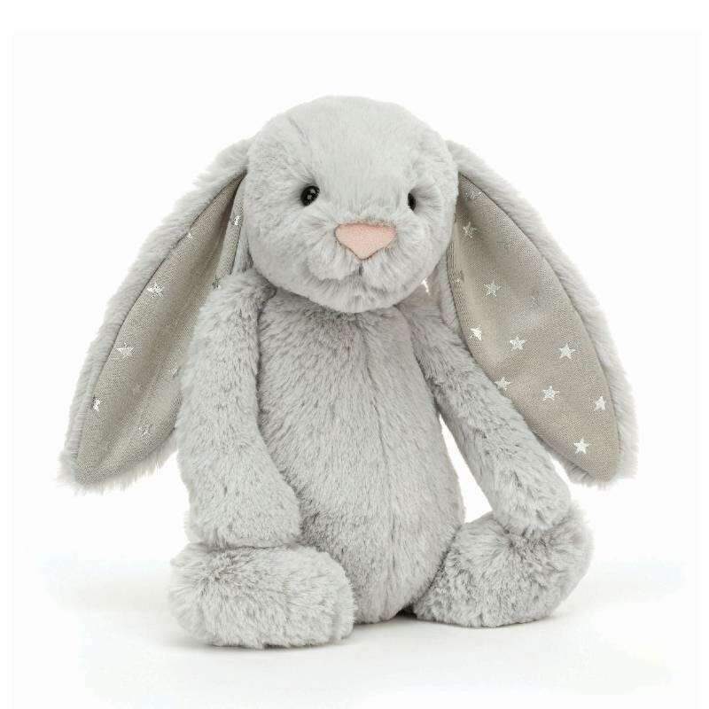 Bashful Shimmer Bunny Small is a wonderful friend that adds a magical touch to your bedtime routine. Its lopsy and snuggly ears conceal silvery stars that shimmer from within. This adorable bunny has glimmery grey fur, a sweet expression, a suedey pink nose, and soft paws that are perfect for cuddling. Its heavenly hugs are sure to soothe you to sleep, making it an ideal calming companion.