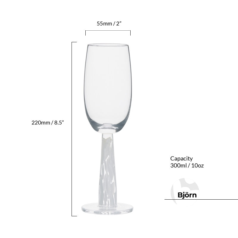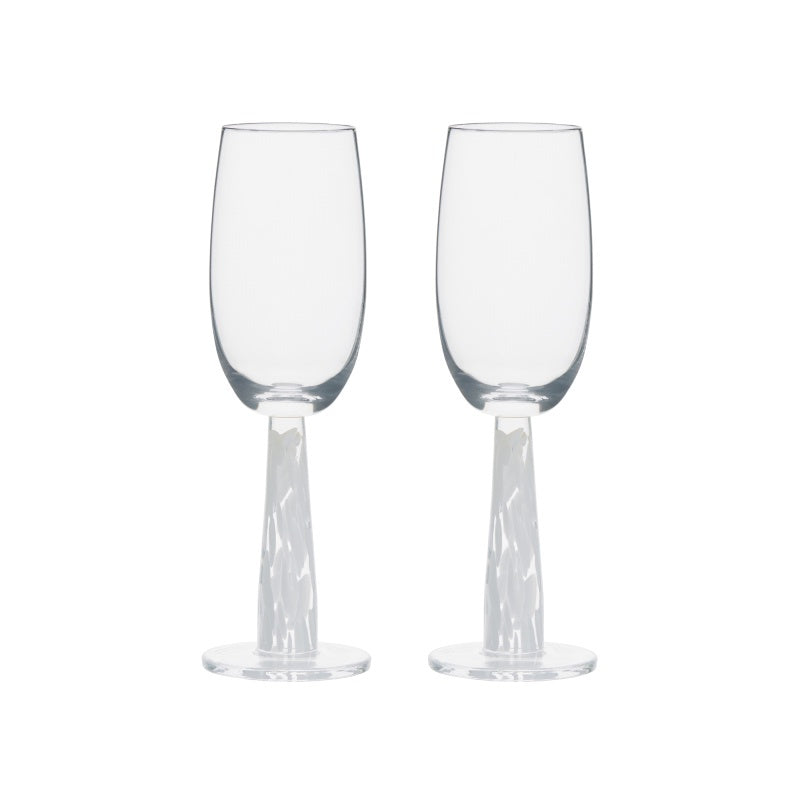 Its signature stem, wide at the base and gently tapering, is decorated with delicate white chips, hand-rolled into the glass, making each piece uniquely individual. A weighty foot plate adds balance and presence, while the softly rounded bowls bring effortless elegance to the table.