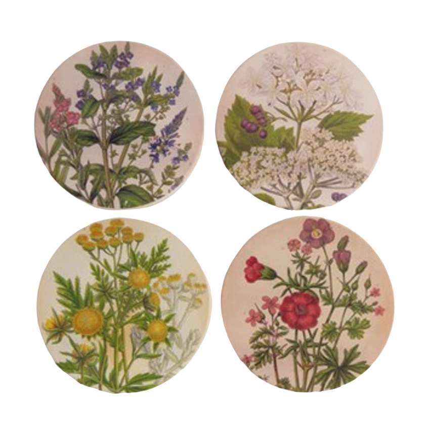 Protect your surfaces with this Coasters Medicinal Plants 9cm Set of 4. These ceramic coasters feature vibrant illustrations of four different medicinal plants, adding a touch of natural beauty to your home. Each coaster is backed with cork to prevent slipping and protect your furniture from scratches. Whether you're enjoying a hot cup of tea or a cold beverage, these coasters provide both functionality and style.